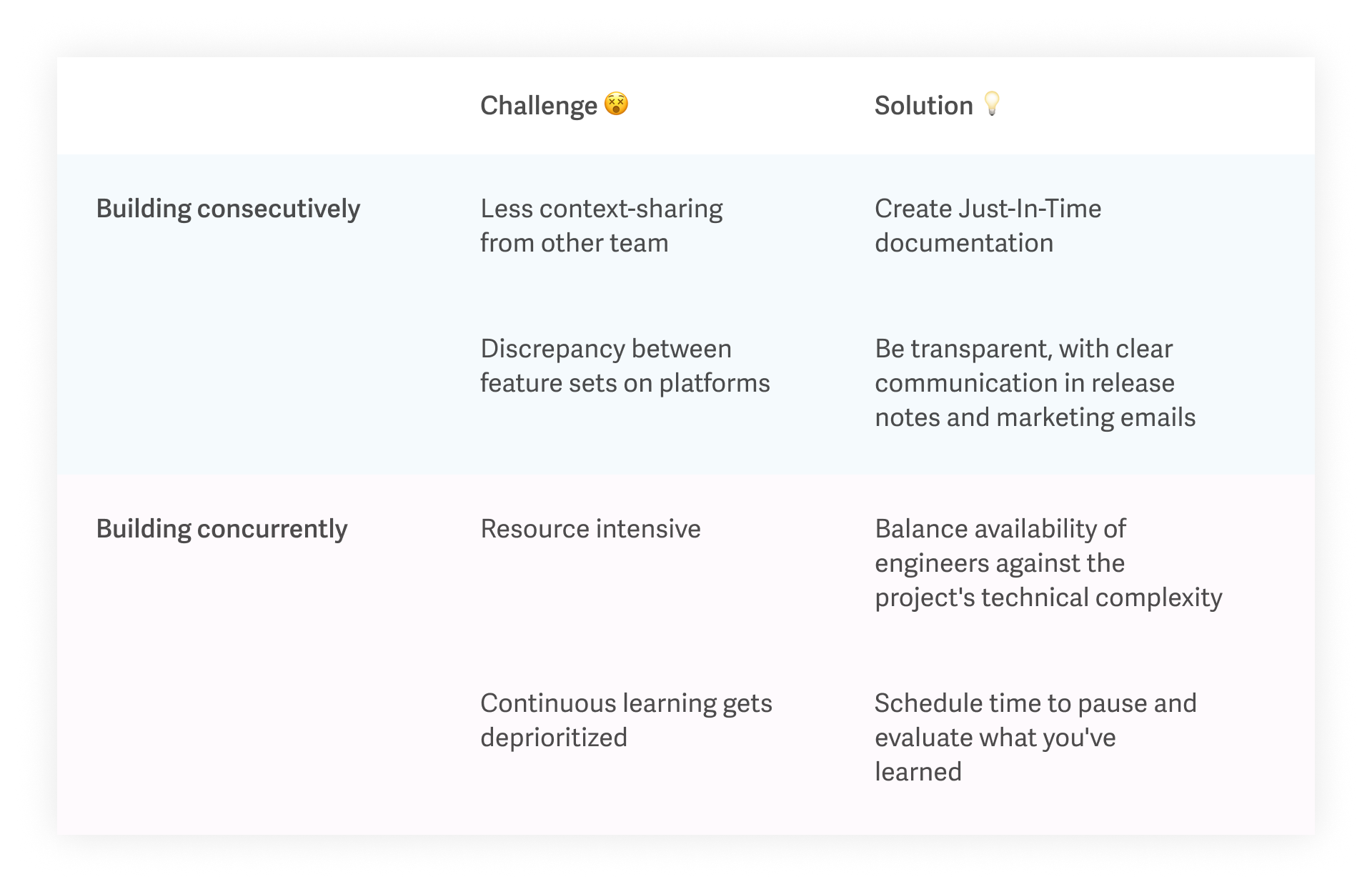There are 2 ways to sequence how your team builds one feature for multiple platforms: consecutively and concurrently.