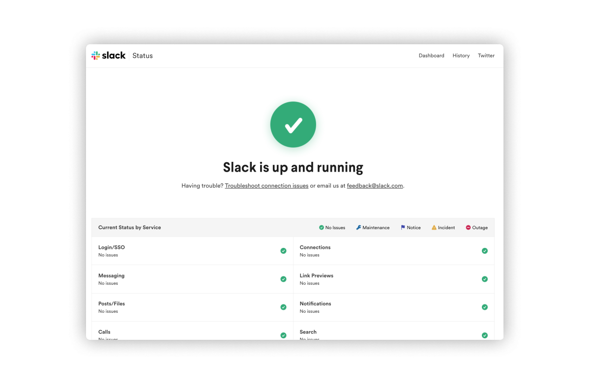 Slack has implemented a dashboard where customers can go if they suspect a problem or an outage. Here, the company communicates clearly if there are any known issues, what impact they're having on customers, and the estimated amount of time needed to fix them. Not only does this give users immediate updates, but it helps manage customer expectations about when to expect solutions to problems.
