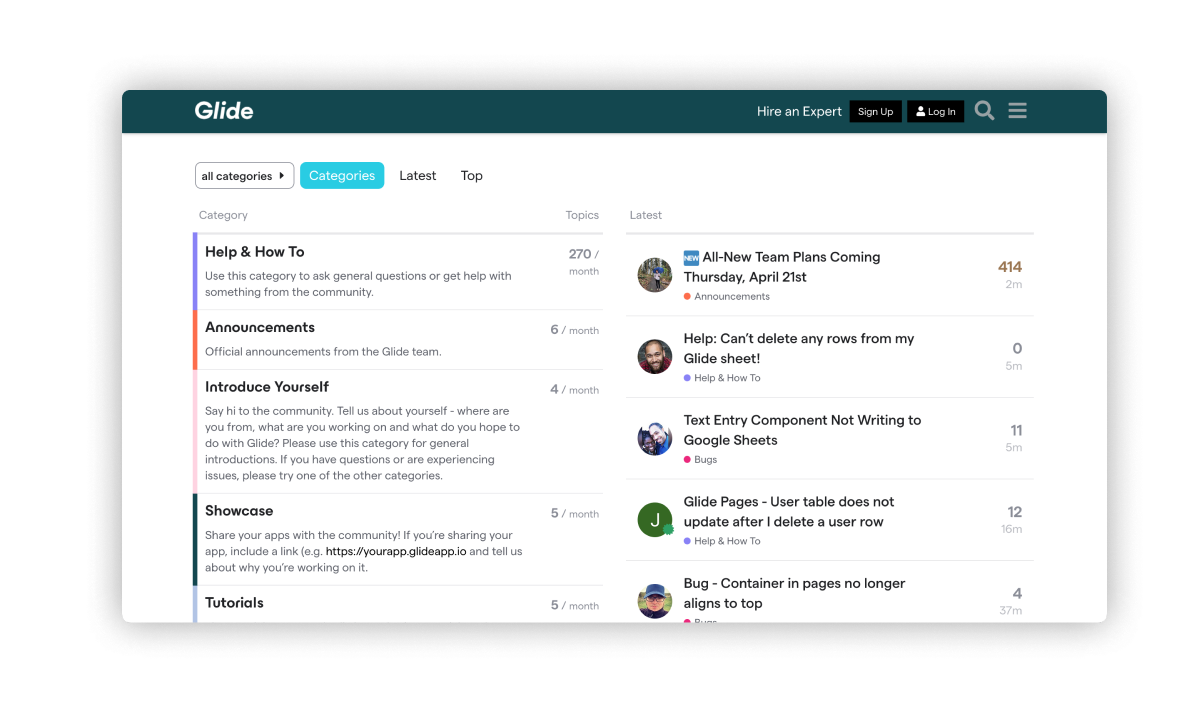 Glide, a no-code mobile app maker, has an extensive, active community where everyone from new users to certified "experts" can ask questions, share tips, and expand their knowledge. Not only does this help educate existing customers to increase their engagement and reduce churn, but it does so with help from other customers, reducing the burden on Glide's CS team.