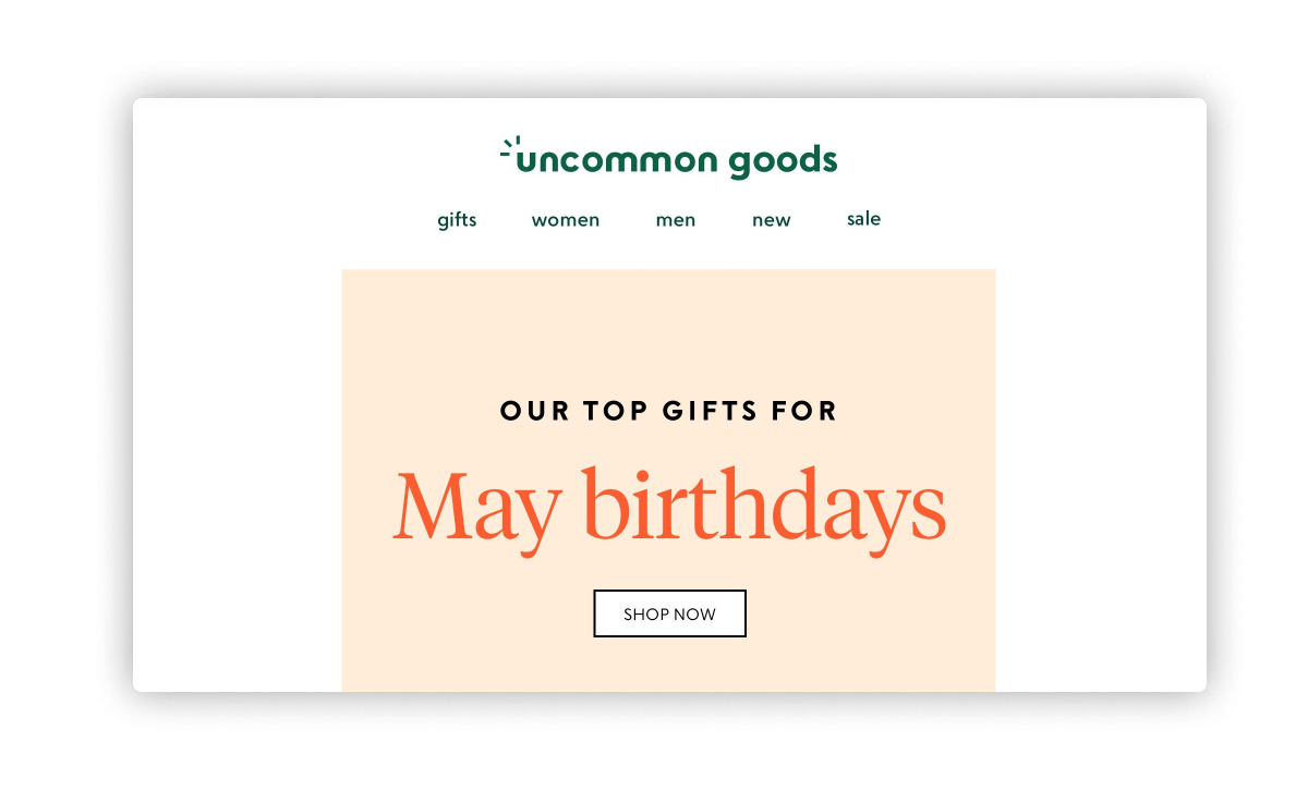 While many brands use email newsletters to highlight new products or send personalized shopping recommendations, Uncommon Goods stands out. This quirky ecommerce store is never pushy about making sales. Instead, Uncommon Goods' email blasts feature products by crafting a story around them. The result is communication that feels less salesy and more natural and engaging.