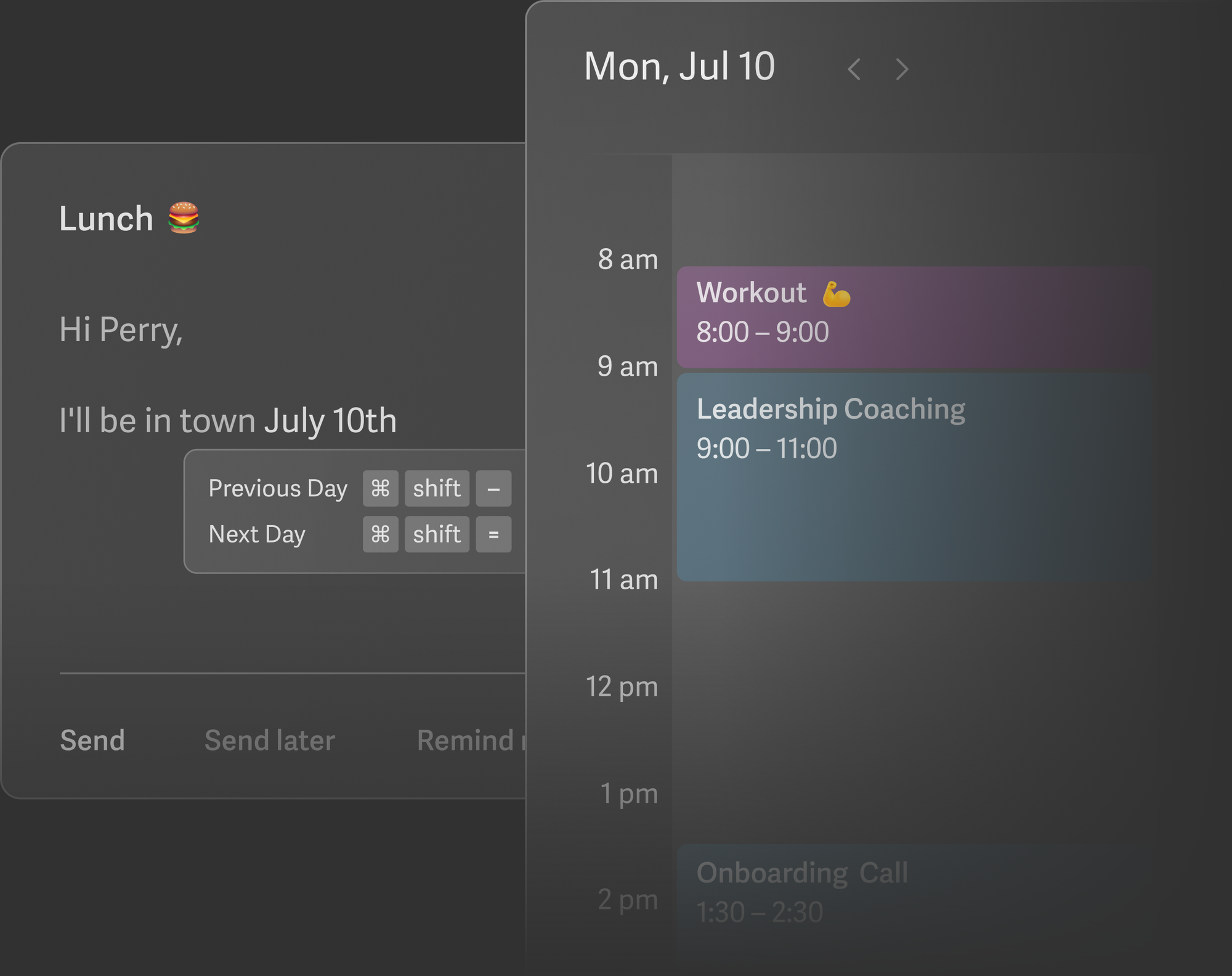 The result: no more tab-juggling and context-switching. A calendar that's as fast and seamless as your Superhuman inbox.