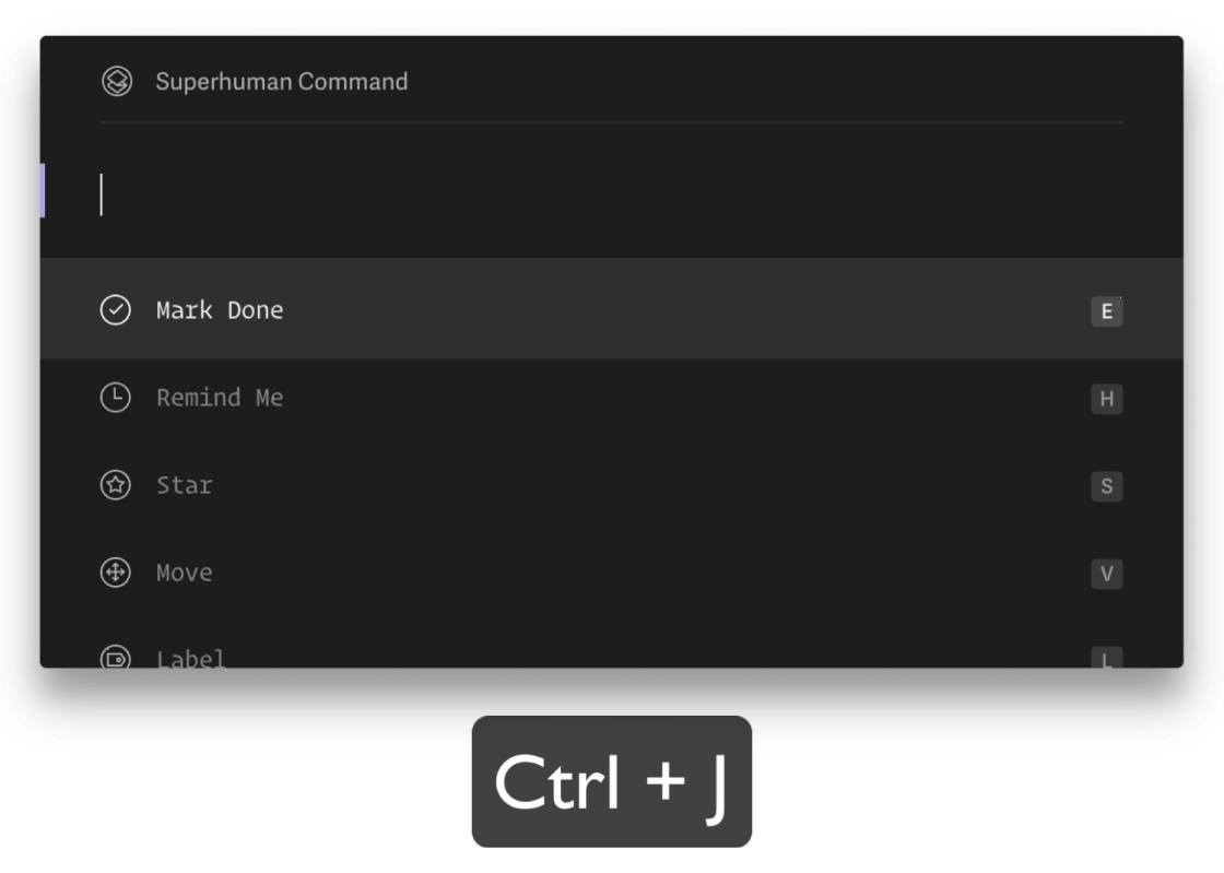 This brings up our command palette. Which contains every action you can take in Superhuman. Plus, shortcuts to do it faster next time!