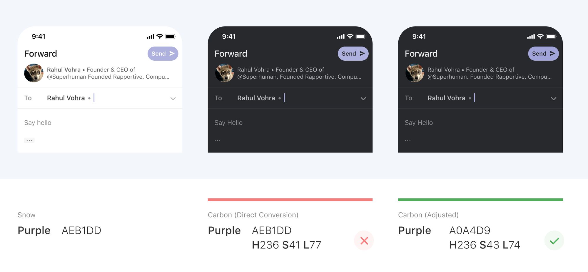 For example, if we directly use the purple from our light theme, it appears too bright against nearby text. In our actual dark theme, we deepen this color so that users can focus on the text.
