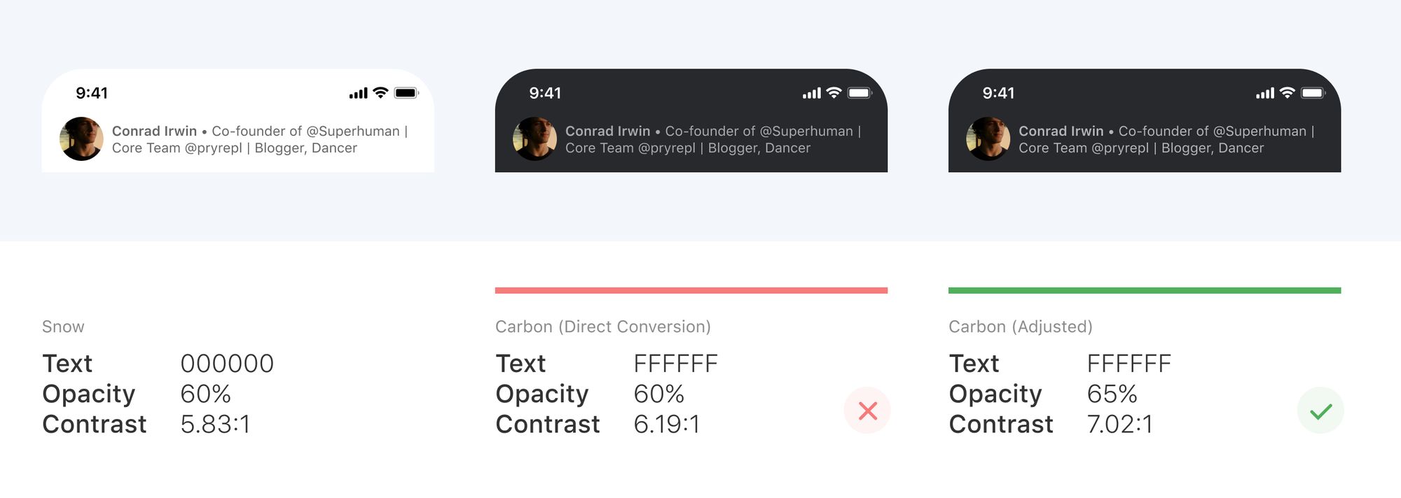 For example, in our light theme, contact details are black with an opacity of 60%. But in our dark theme, we set contact details to white with an opacity of 65%. While both contrast ratios exceed AA standard, the extra 5% prevents fatigue, especially in low light conditions.