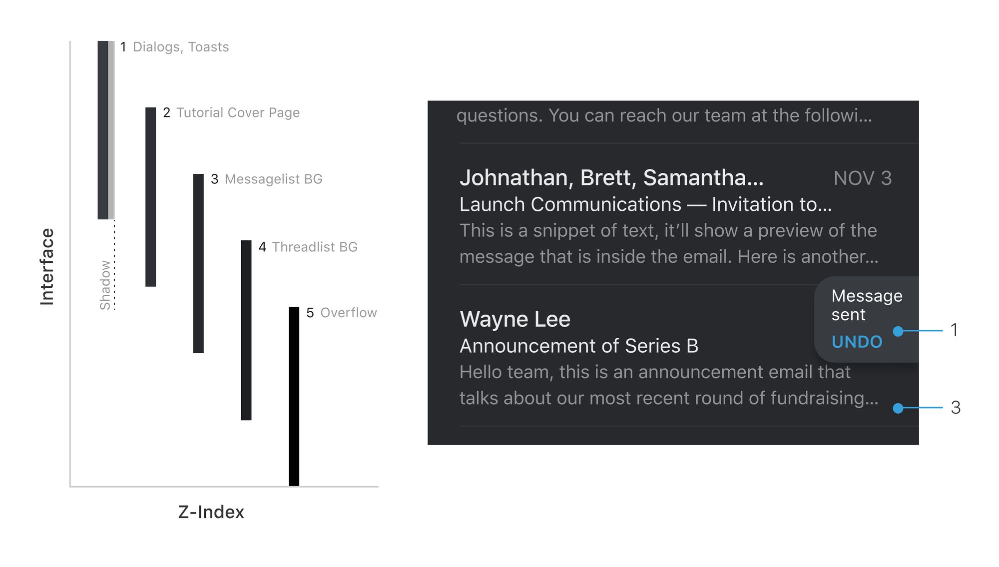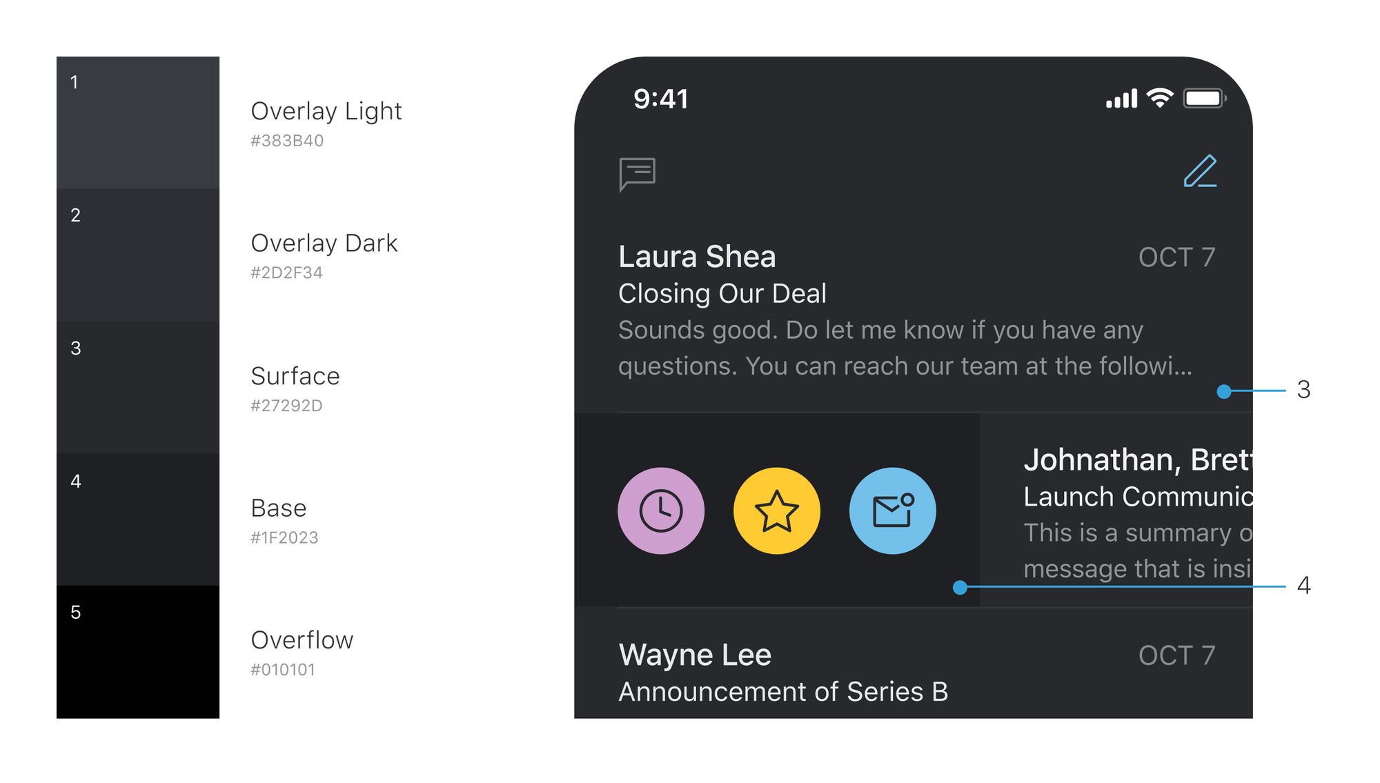 In Superhuman Mail, our dark theme is made of five shades of gray. Nearer surfaces use lighter grays; more distant surfaces use the darker grays.
