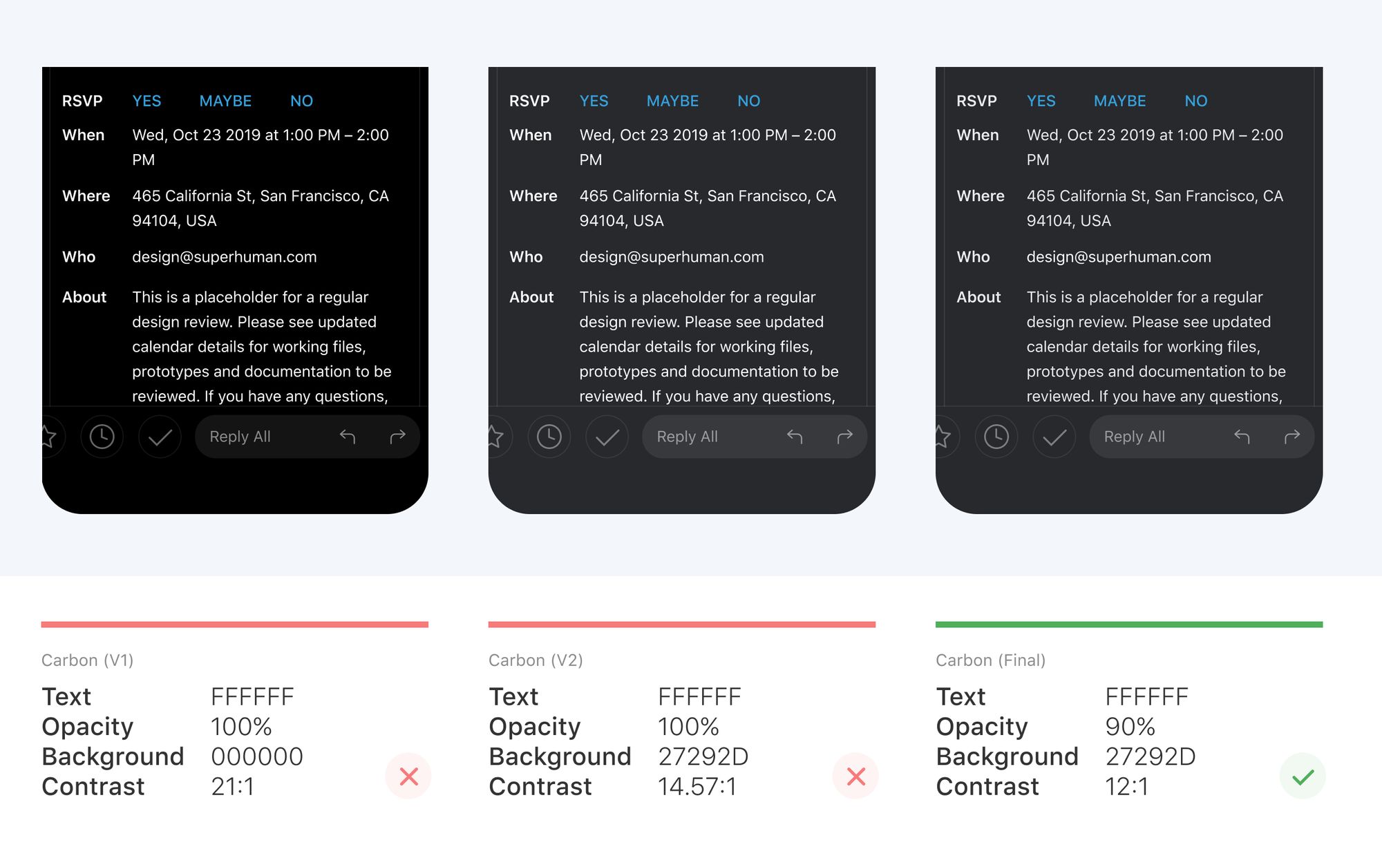 In Superhuman Mail, we have to be particularly careful about halation, as our app is very text heavy. We set our white text to 90% opacity so that the dark background blends through. This balances contrast and brightness so that the app is easy to read in a wide variety of light conditions.