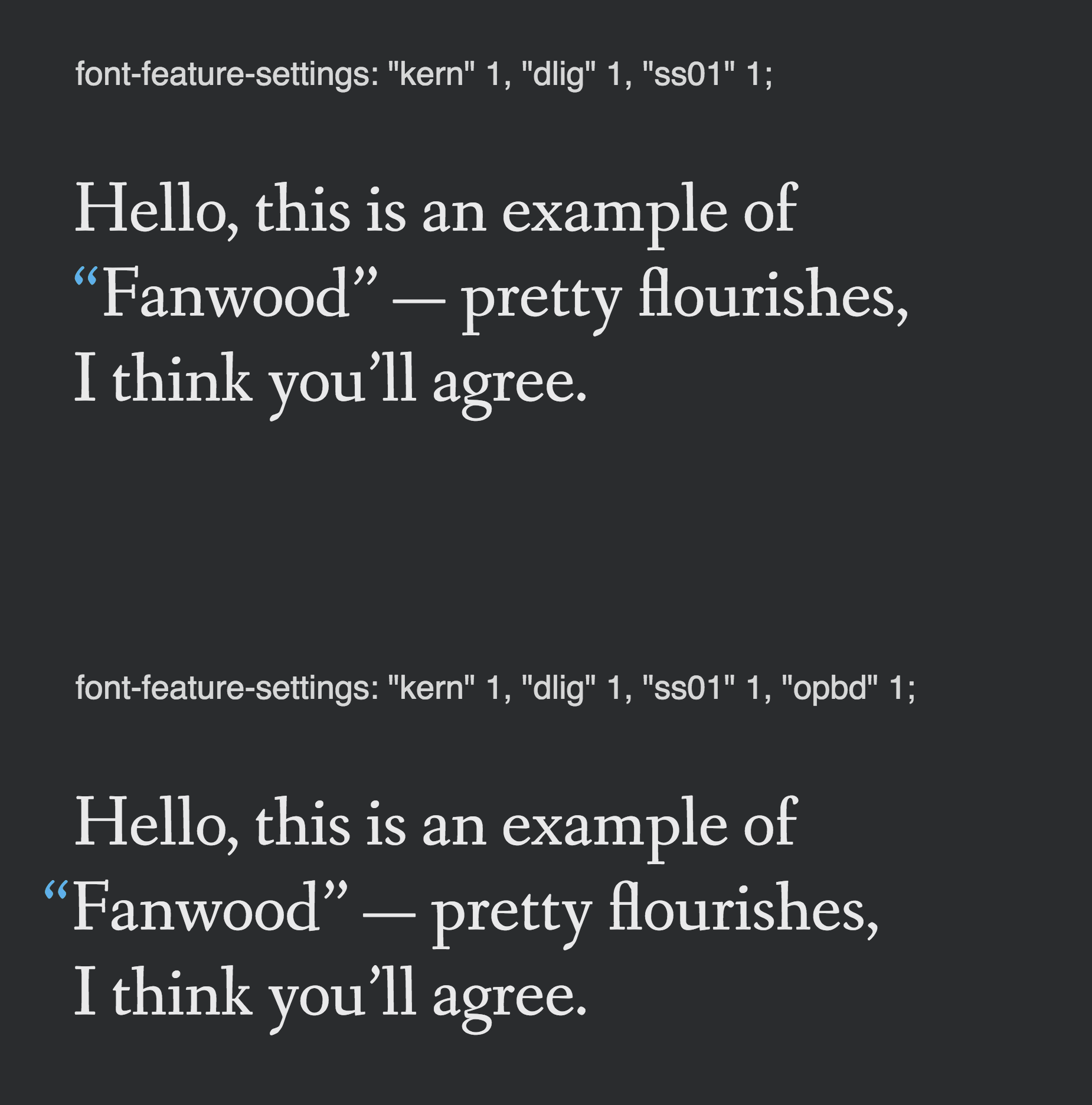 pos quoteleft' <-228 0 -228 0>;The positioning rules move the left and right of the glyph independently. The number 421 comes from looking at the glyph for a curvy left quote and taking its width including some spacing. I only needed to look at the curly left-quote, because the "opbd" feature is defined after "ss01" and so all the plain quotes have already been replaced at this point.