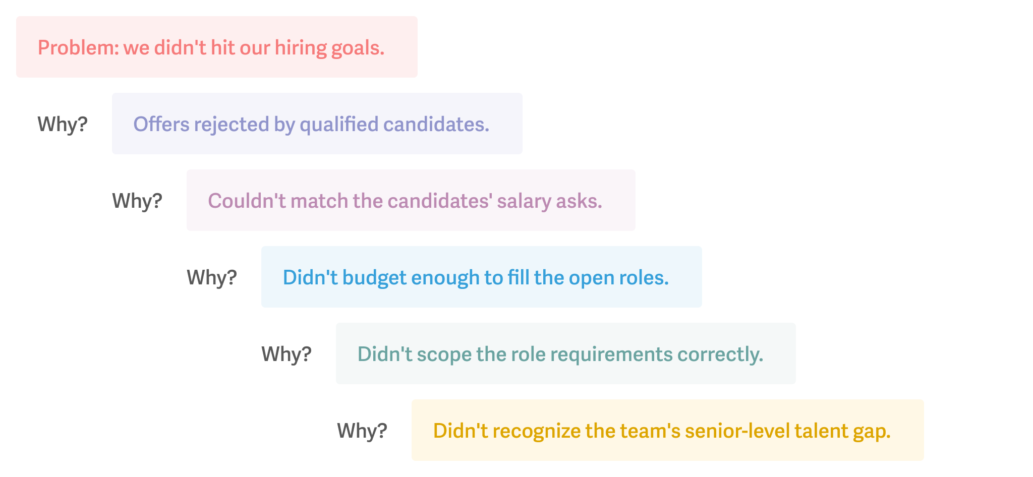 You think you know why: qualified candidates keep turning down offers. But to reveal the real problem, ask why 5 times. You'll see a chain reaction with multiple points of failure. Then critically examine each link in the chain. Which ones should you fix?