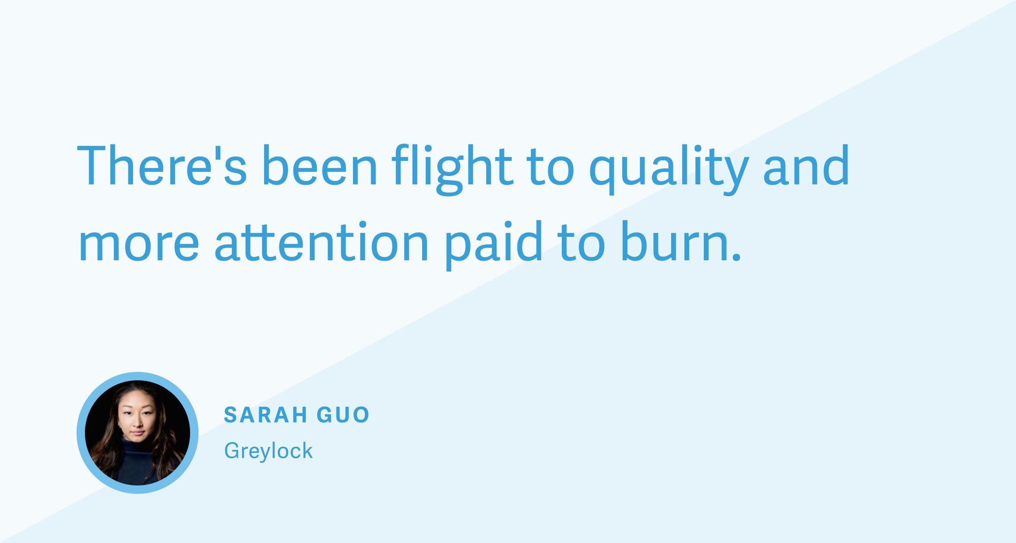 "There certainly is capital available, but it's not for everyone anymore," explains Sarah. "I do not feel that the rounds that I have been a part of very recently are in any way cheap or structured differently than previously. I would say that there's been flight to quality and more attention paid to burn."