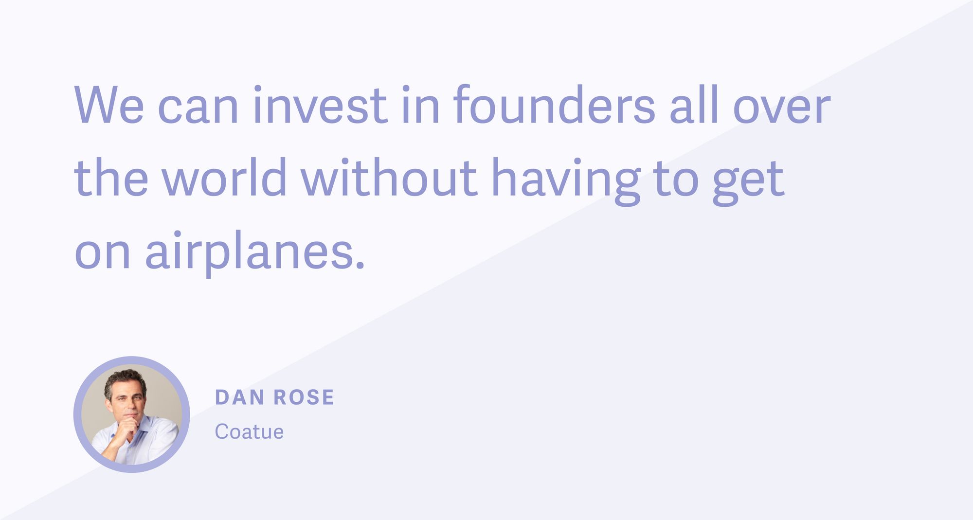 "First and foremost, it makes it possible for us to invest in founders all over the world now without having to get on airplanes," enthuses Dan Rose of Coatue. "If you no longer have a hard requirement that you'd have to meet somebody in person before you can invest in their company, you're suddenly unlocking entrepreneurial talent from all over the world."