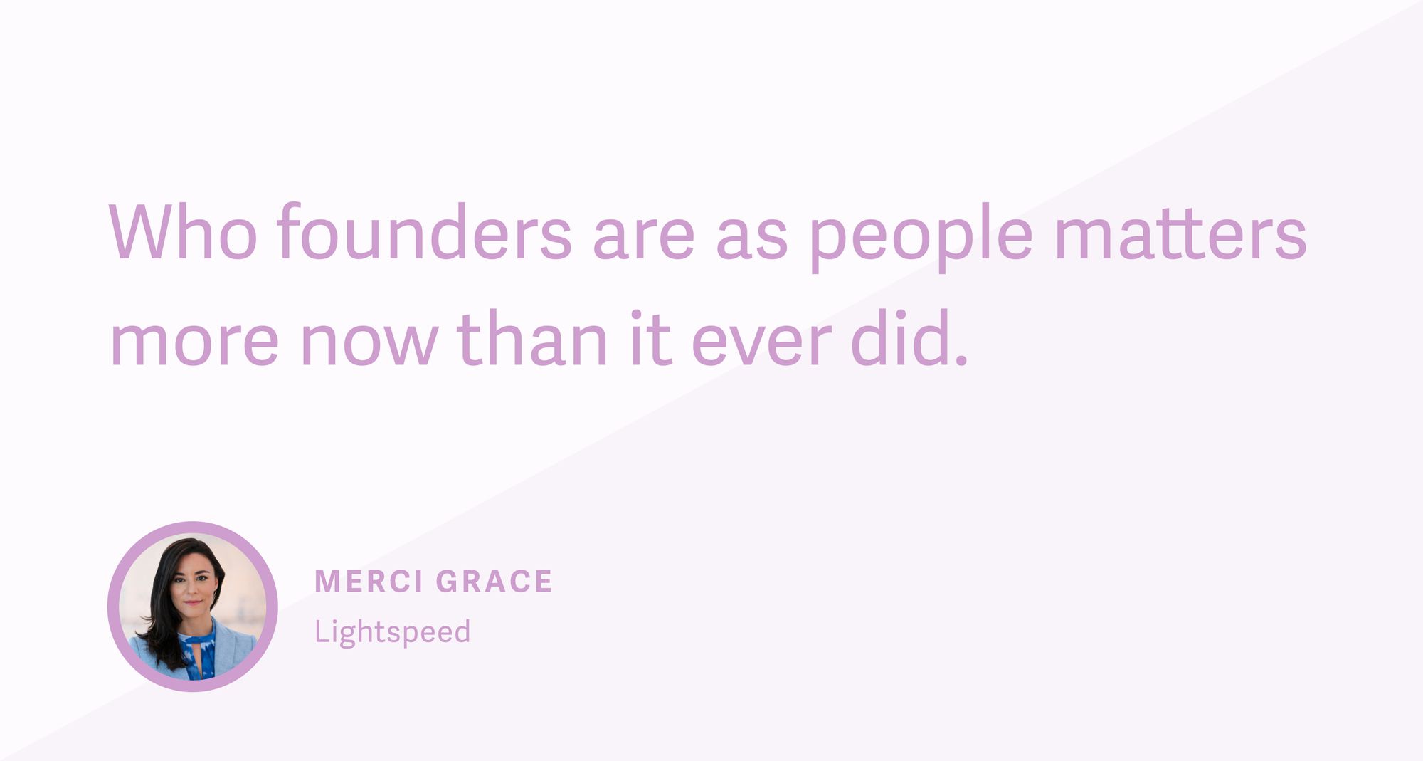 "Who founders are as people and how they carry themselves in the world matters more now than it ever did," advises Merci Grace of Lightspeed. "And that trend will just continue. There's no longer a separation between your personal life and your business."