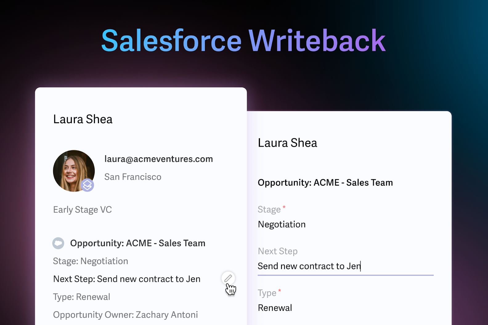 With Salesforce writeback, sales reps can maintain an up-to-date CRM at Superhuman speed, without breaking flow or switching context. You can update the status of an existing prospect, or simply add a new contact.