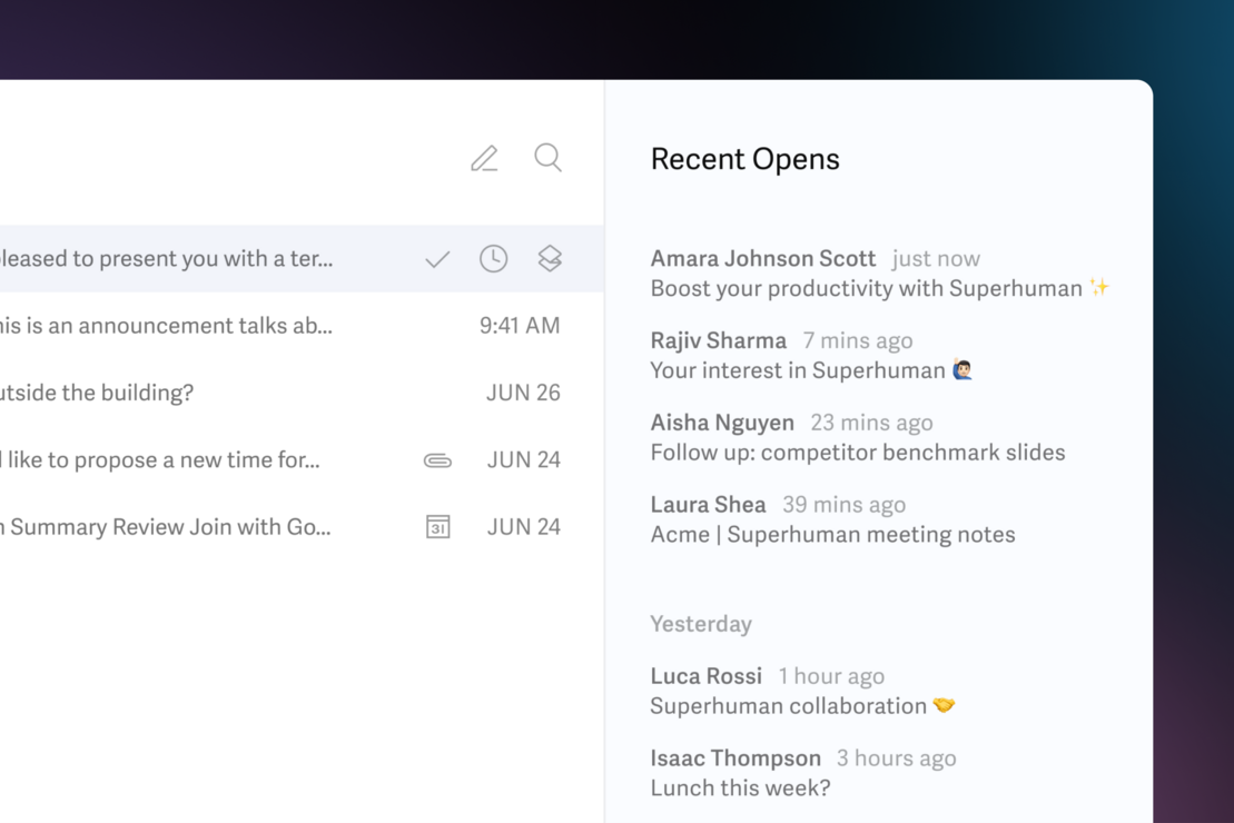 Because Superhuman helps me be very responsive to email, I can close more deals, faster. Plus, features like the Recent Opens Feed and Reminders help me and my team win opportunities that we could have missed otherwise.