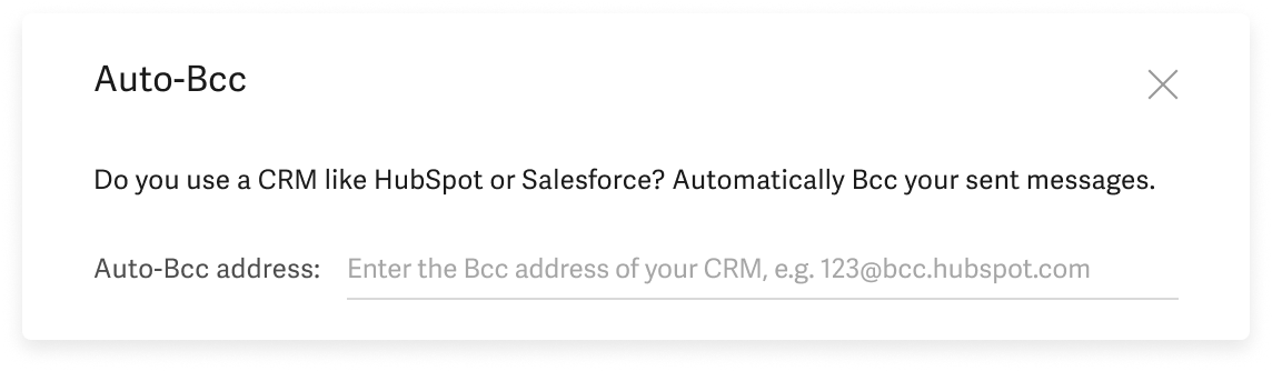 hit Cmd+K or Ctrl+K โ Auto-Bcc Settings. Paste the Salesforce bcc address, and hit Enter to save.