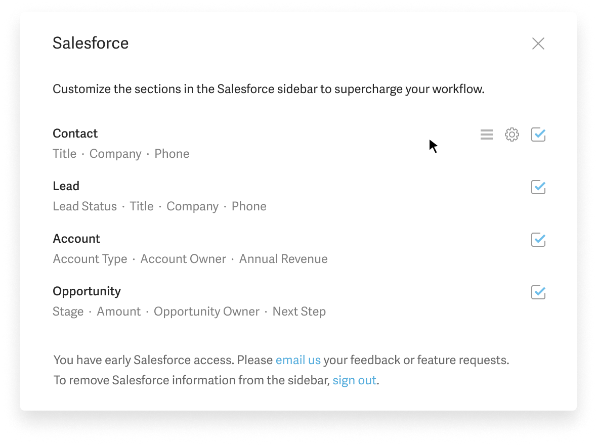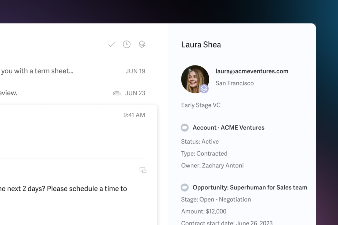 Superhuman shows Salesforce contacts, leads, accounts, and opportunities right inside your inbox.