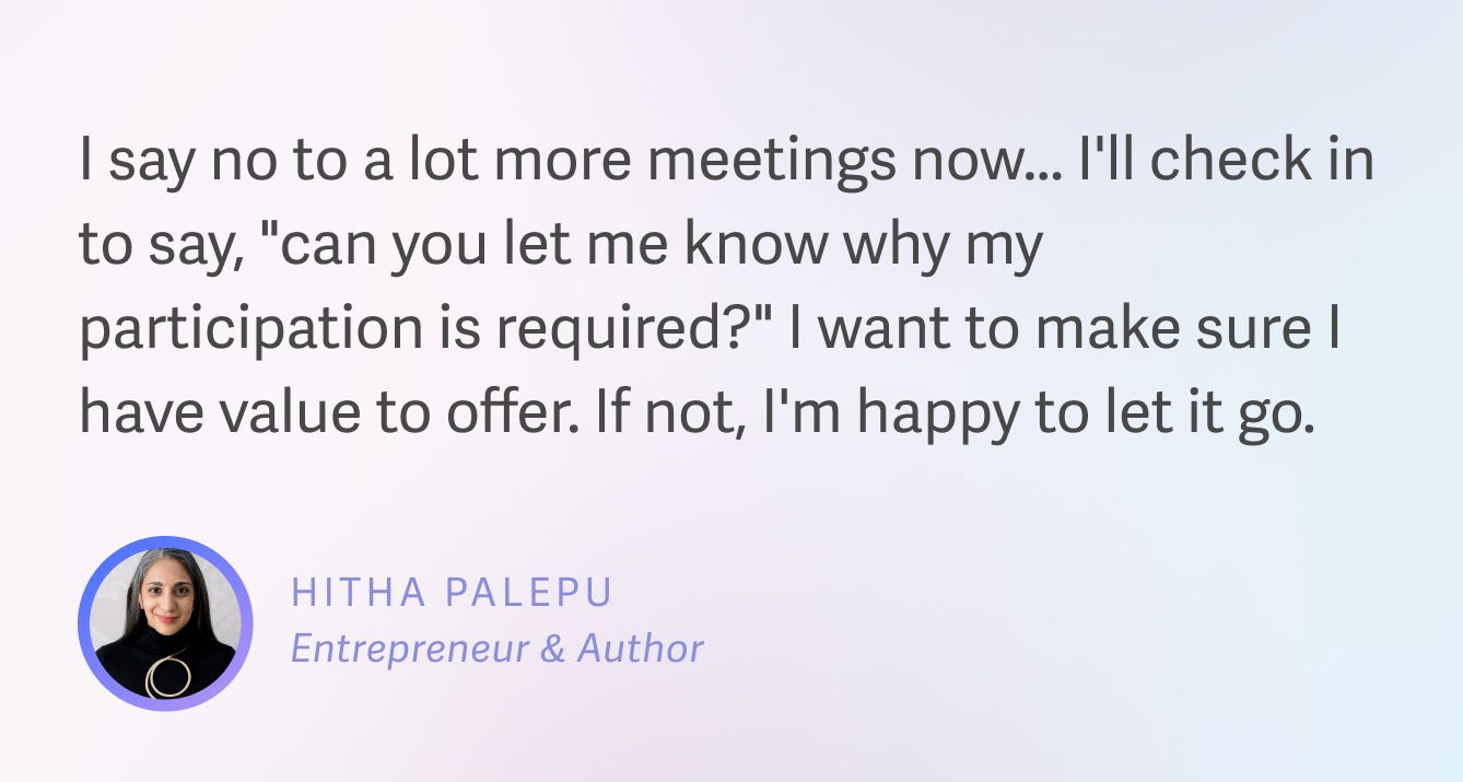 One thing I've noticed is that I say no to a lot more meetings now. If I know I don't have anything to contribute, I'll check in to say, "Can you let me know why my participation is required?" I want to make sure I have value to offer. And if not, I'm happy to let it go. This has been a big one.