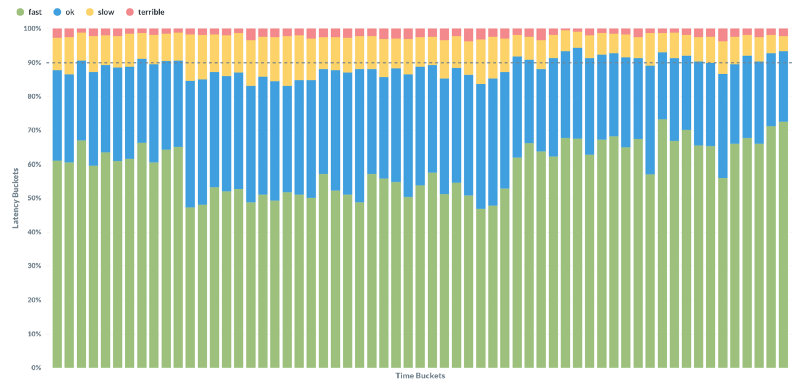 In order to visualize the impact of performance optimization, we add additional thresholds above and below 100ms. We group latencies into <50ms (fast), <100ms (ok), <1000ms (slow) and "terrible". The terrible bucket lets us see where we are severely missing the mark, which is why we color it bright red. The 50ms bucket is very sensitive to changes; performance improvements are often visible here well before the 100ms bucket.