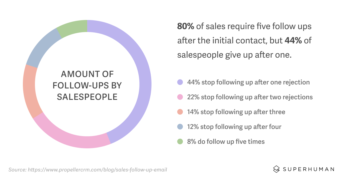 In fact: 80% of sales require five follow ups after initial contact. 44% of salespeople give up after just one email!