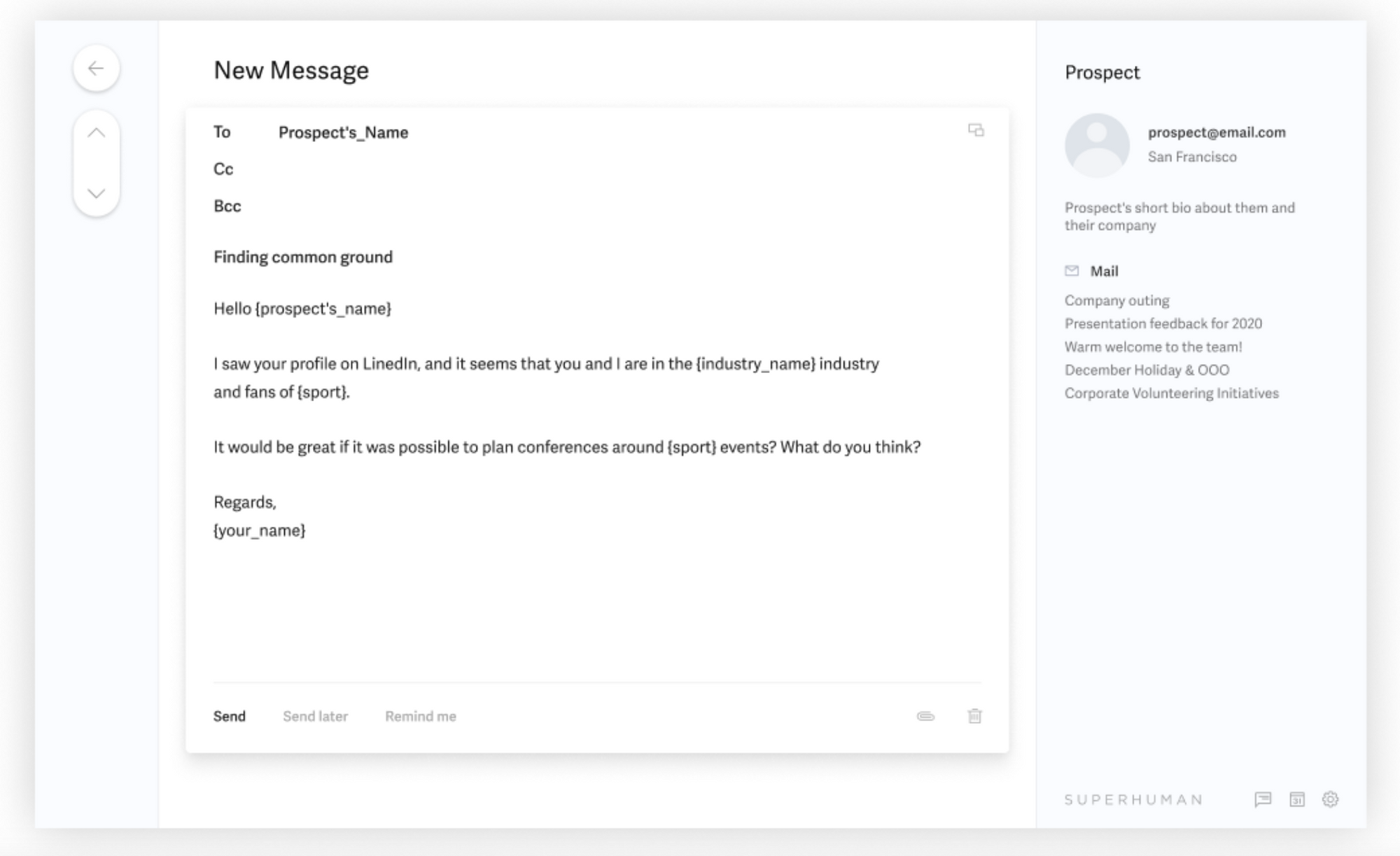 How Superhuman can help: Quickly craft an effective and personalized email with embedded CRM data from Superhuman’s Salesforce and HubSpot integrations. No need to switch back and forth between your email client and CRM to get the information you need.