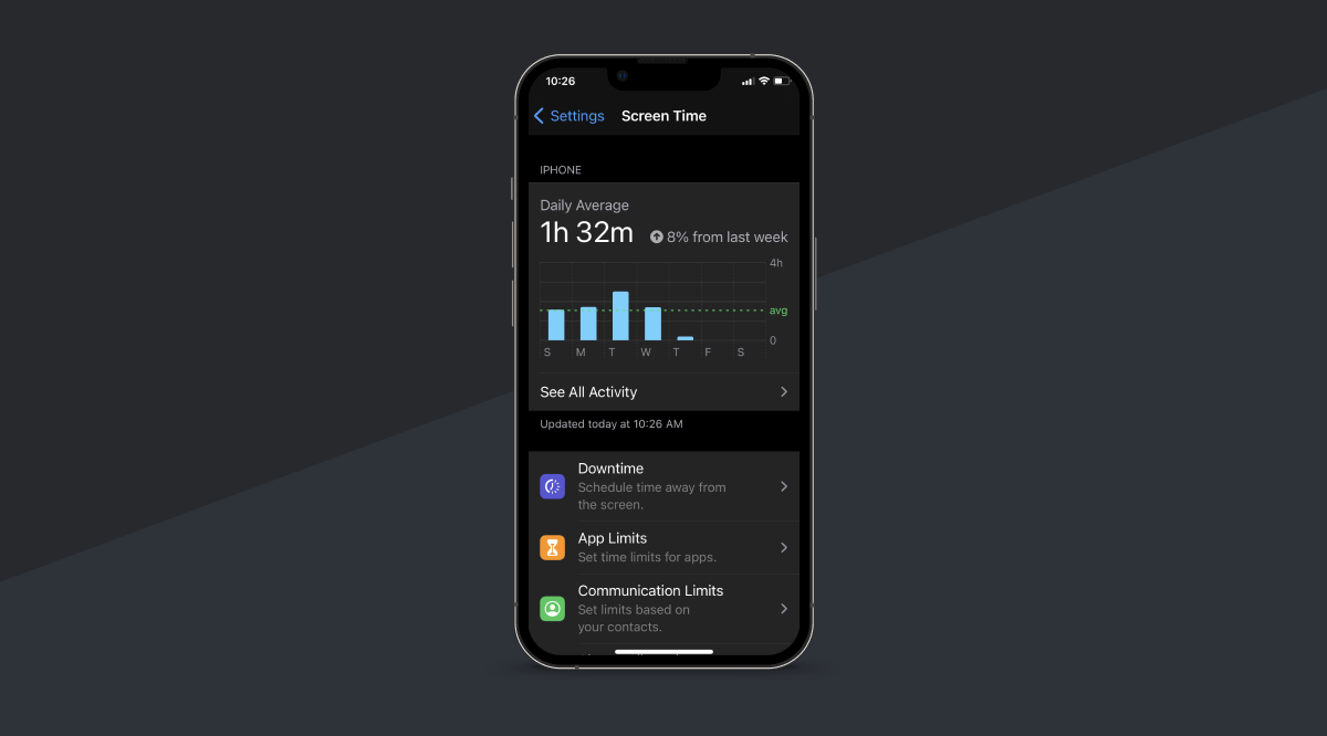 Before you decide what steps you should take to change your screen time habits, collect data to help inform those decisions. Many phones have screen time reporting built in (for example, on iOS go to Settings and click "Screen Time" to see a detailed report), or you can get a habit tracker app that tracks and analyzes your average screen time, and what you spend that time doing (for example, time spent on social media versus checking email, reading the news, or checking Slack).