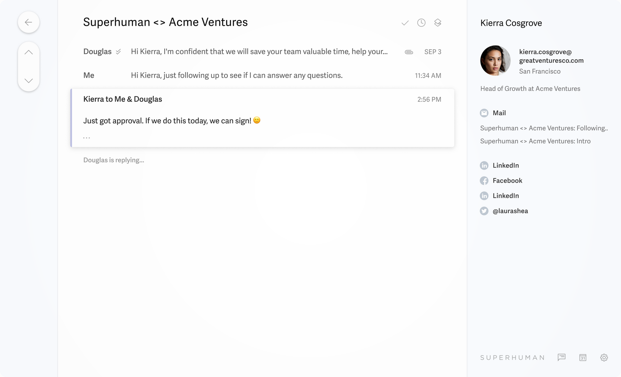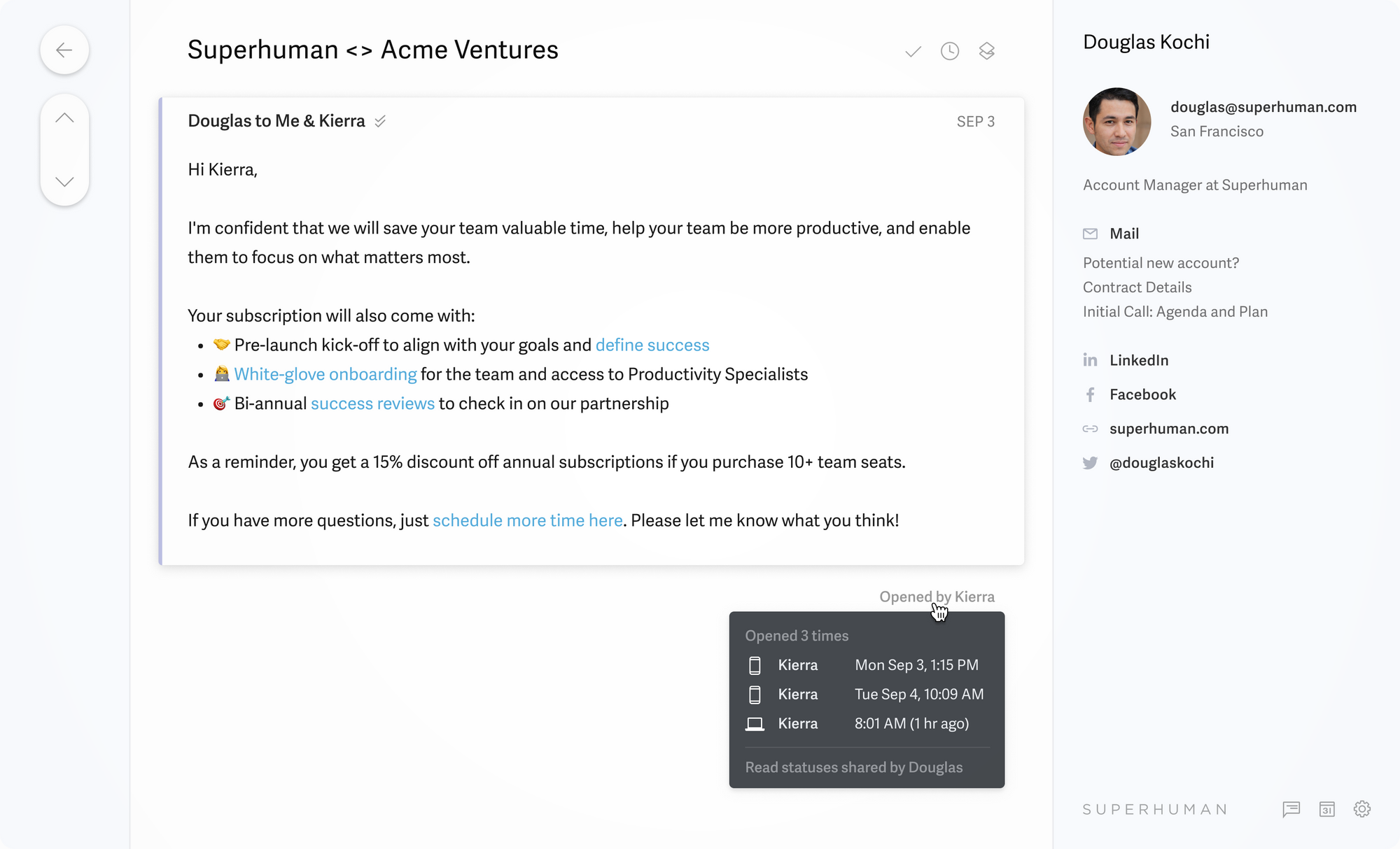 Superhuman is a key tool in our tech stack that everyone gets onboarded to when they join the team. With the peace of mind an organized inbox brings, they can focus on doing what matters most to the business.