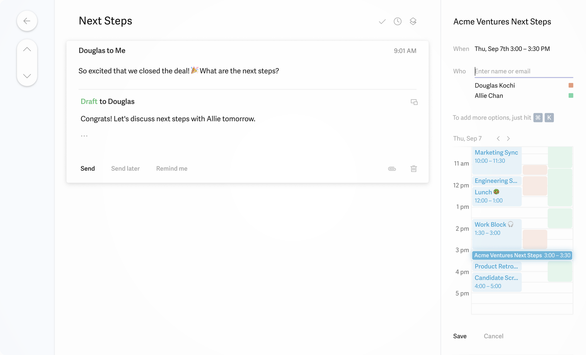 We designed the experience to be keyboard-driven, blazingly fast, and surprisingly fun. Now you can stay in flow, and schedule at the speed of thought.