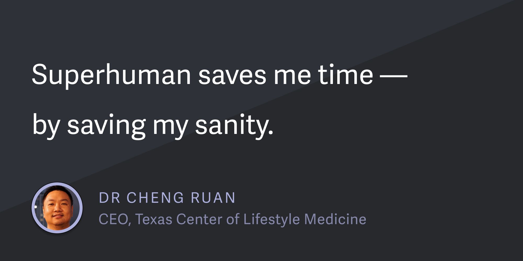 Dr. Cheng Ruan is the CEO of the Texas Center for Lifestyle Medicine. He is also a consultant who helps other physicians leverage the latest productivity and automation tools to run their practices more efficiently. Here's how Superhuman helps him level up as a leader and a consultant, delegate to his team, and juggle multiple workstreams…