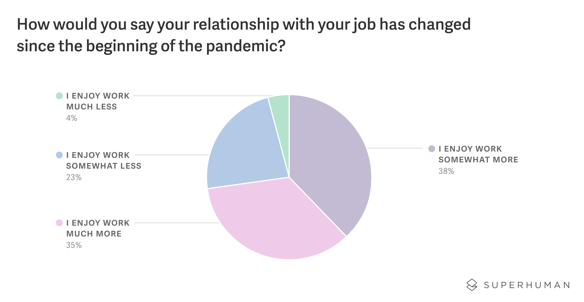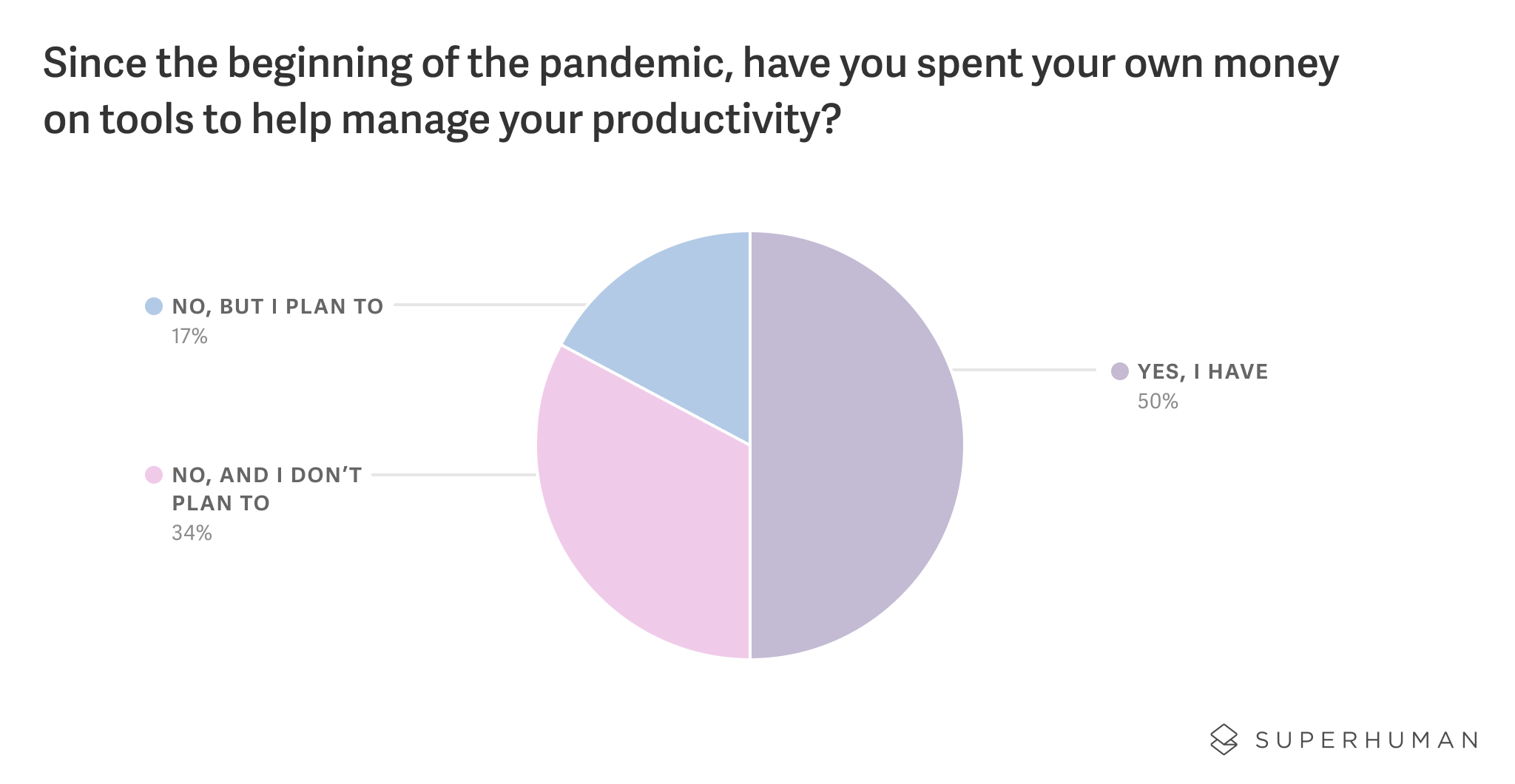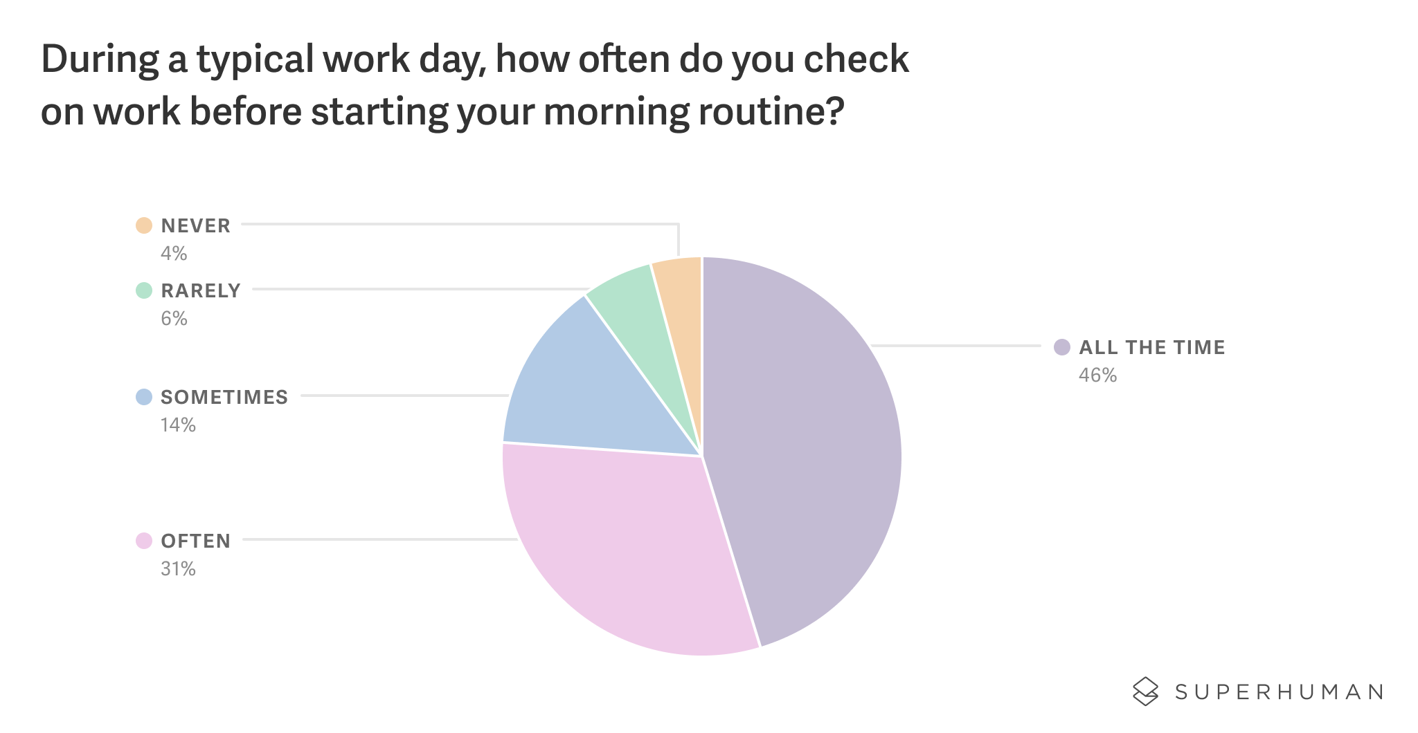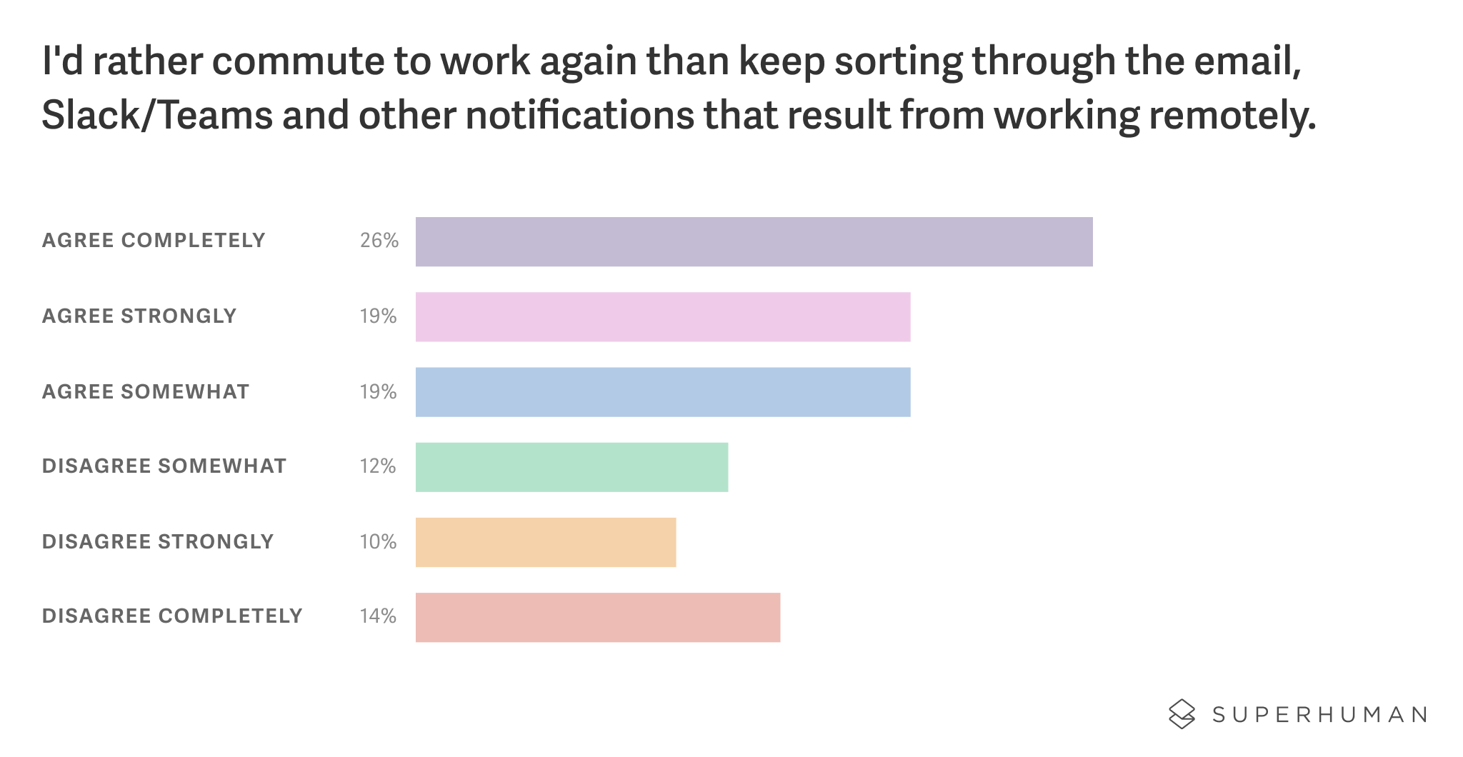 The data above was drawn from an online survey of 1,000 US-based remote workers who work from home and do not use Superhuman. The survey was conducted in February of 2021 by a professional research firm. The data was weighted to ensure an accurate and reliable representation of the US population.