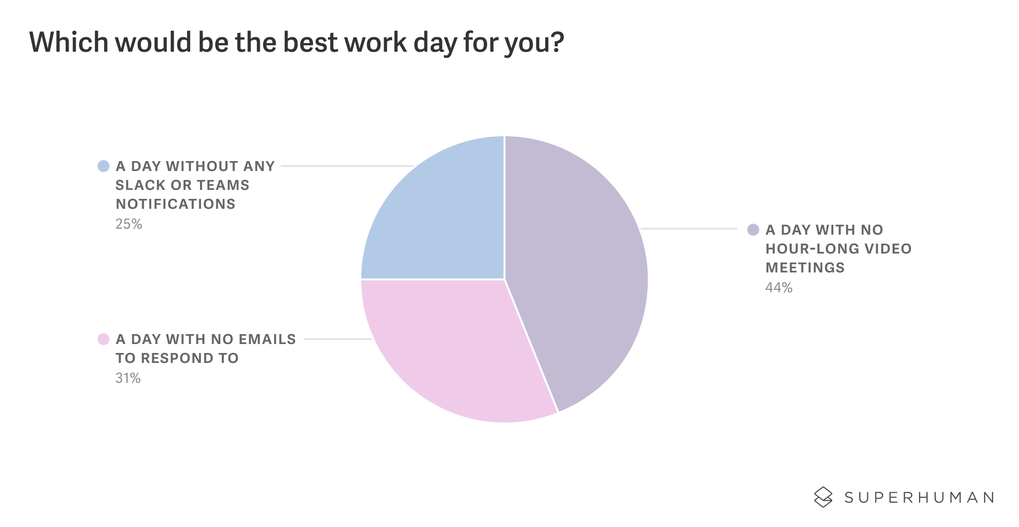 When asked what they needed a break from most, video calls topped remote workers' wish lists β but email and messages aren't far behind. Though almost half of remote workers (44%) dream of a work day without video calls, nearly a third (31%) want a break from email. The remainder (25%) crave a notification-free day.