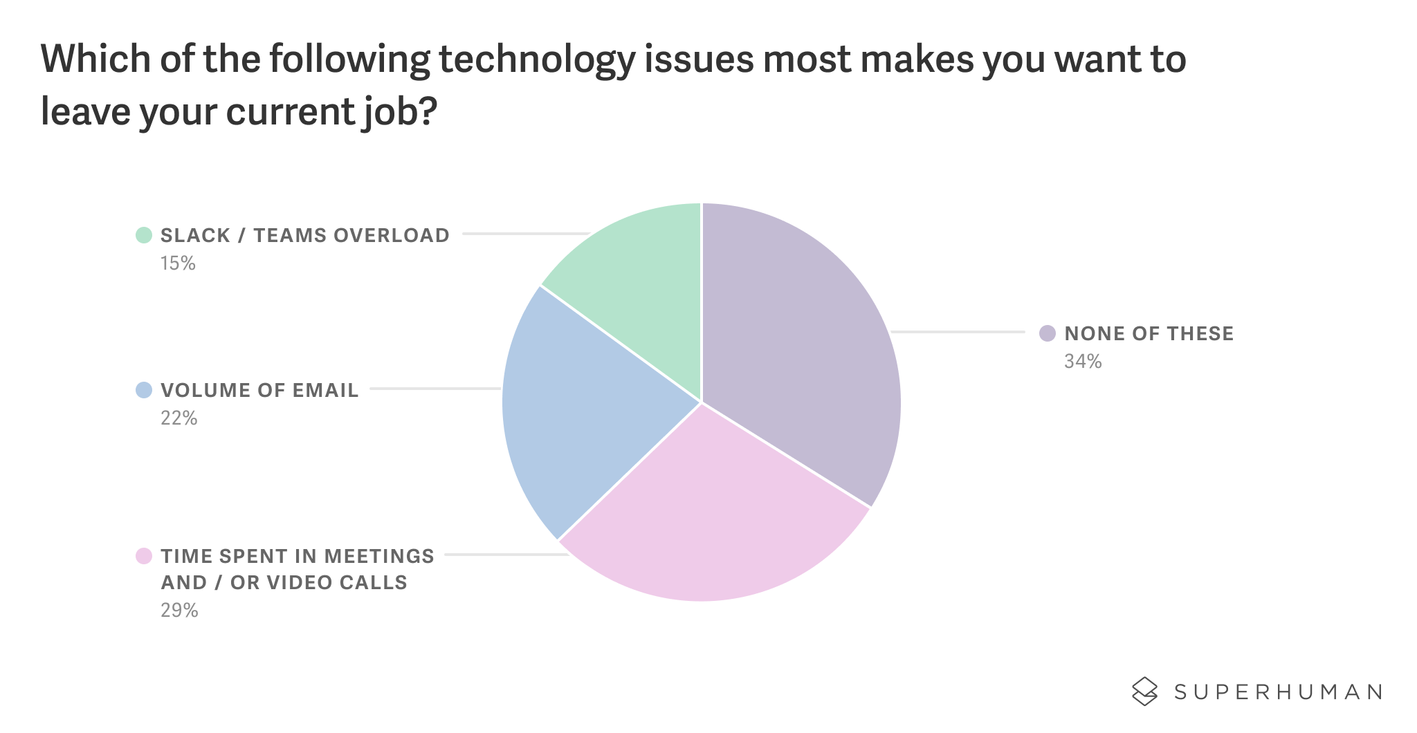 A whopping 22% of remote workers want to leave their current job because of the volume of email they receive. Only video calls are a bigger pain point β for 29%, this is the technology issue that most makes them want to quit.