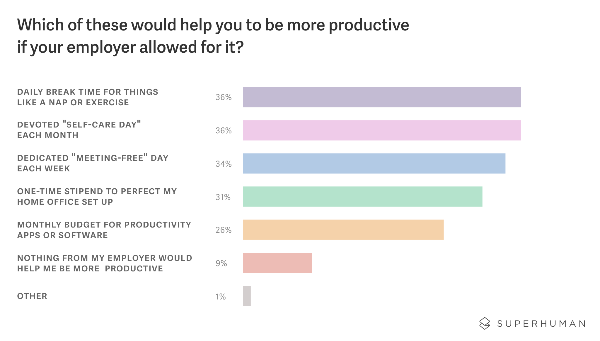 Policies like daily breaks (36%) and devoted self-care time (36%) top the wish lists of remote workers. And employers, take note: more than a quarter (26%) of remote workers say they'd be more productive with a monthly budget for productivity apps or software.