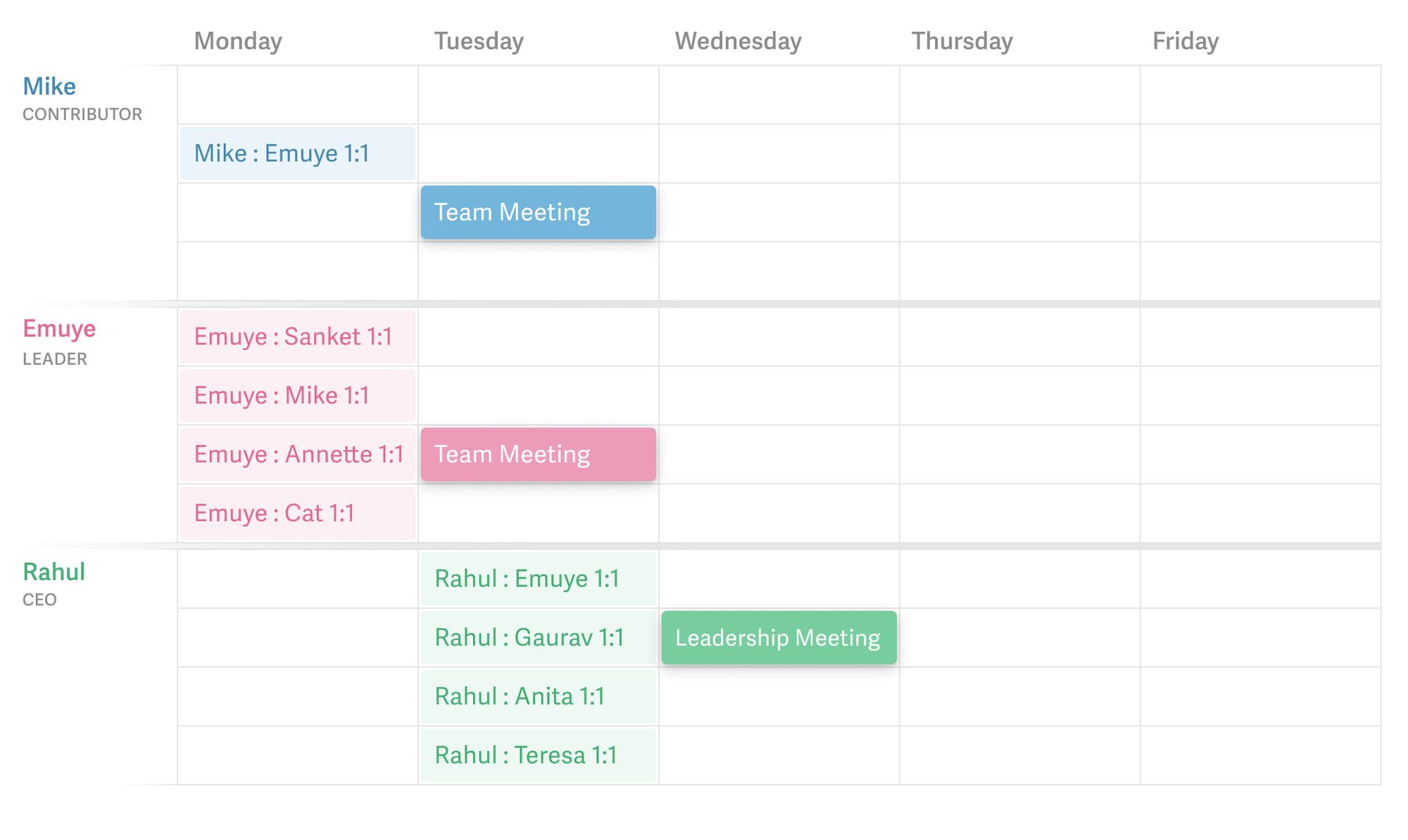 Many of us unintentionally combine these schedules. Team meetings happen when everyone is free. 1:1s are scattered throughout the week. Which leaves little time for deep work.